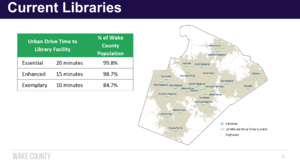 Staff used the State of North Carolina Library's standards for siting and renovating local libraries, including that all residents should be within a 10 minute drive of a library in urban areas.[2] For instance, adding a library in Rolesville increases the percent of Wake County residents having a library within a 10-minute drive from 84.7% to 87.0%.[1]